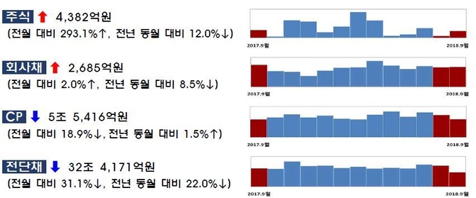 31일 금융감독원이 발표한 자료에 따르면 9월 중 주식과 회사채의 총 발행실적은 14조1641억원을 기록했다. 이는 전월 대비 7067억원 증가한 수치다.