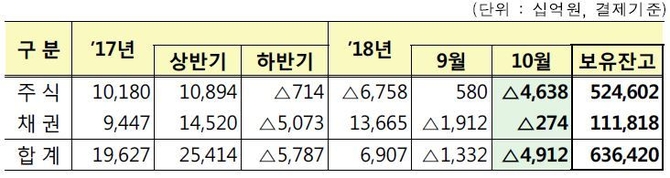 금융감독원이 12일 발표한 ‘2018년 10월 외국인 증권투자 동향’에 따르면 지난달 중 외국인은 상장주식 4조6380억원을 순매도한 것으로 집계됐다. 지난 6월 이후 4개월 만에 순매도로 전환됐으며 2013년 6월(5조1470억원) 이후 최대치를 기록했다.