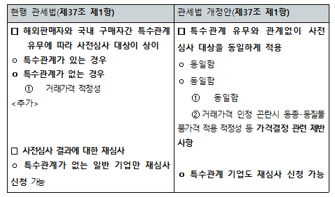 정부는 이번 관세법 개정안에서 세무행정의 효율화 및 납세자의 편의를 제고하기 위해서 해외 수출자와 특수한 관계가 있는 수입자인지 또는 특수한 관계가 없는 수입자인지 구분하지 않고 동일한 경우에 과세가격 사전심사 제도를 이용할 수 있도록 하였다.