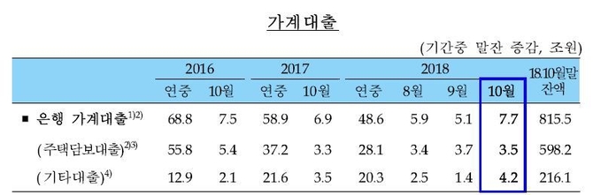 13일 한국은행이 발표한 ‘2018년 10월 중 금융시장 동향’에 따르면 은행권 가계대출액은 지난 한 달 동안 총 7조7000억원 늘어났다. 전월(5조1000억원) 보다 증가폭이 2조6000억원 확대됐으며 2016년 11월(8조8000억원) 이후 최대 증가폭을 기록했다.