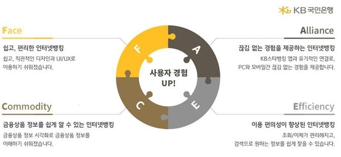 이번 개편은 모바일 중심 시대에 맞춰 인터넷뱅킹의 편의성을 모바일 수준으로 높이고 PC와 모바일 간 연결을 통해 금융 서비스를 쉽고 빠르게 이용할 수 있도록 4가지 콘셉트(FACE)를 적용한 것이 특징이다.
