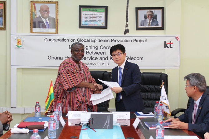 (조세금융신문=김성욱 기자) KT는 16일(현지시간) 가나 아크라에서 가나 보건청과 ‘빅데이터를 활용한 감염병 확산방지 시스템 구축 협력 MOU’를 체결했다고 18일 밝혔다.