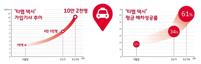 이에 따라 배차 성공률도 높아지는 선순환 효과가 발생하고 있는 것으로 풀이된다. T맵 택시 평균 배차 성공률은 앱 리뉴얼 전인 지난 6월 말에는 약 17% 수준이었으나 최근에는 약 61%로 상승했다.