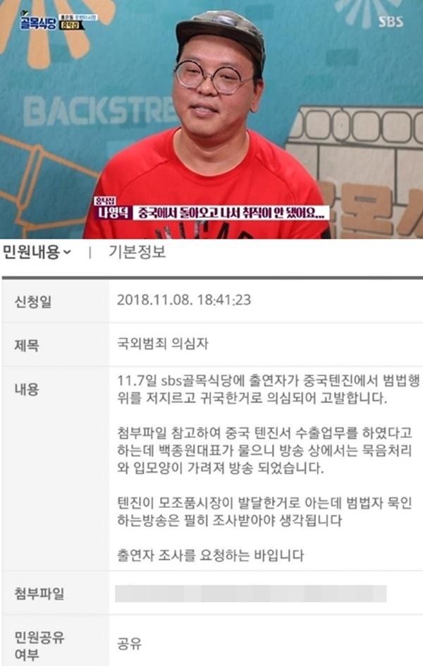 그러나 이후 한 누리꾼은 온라인 커뮤니티 '디시인사이드'를 통해 그를 국외 범죄 의심자로 신고했다고 밝히며 "수출업무를 했다고 하는데 방송에선 묵음 처리됐다. 해당 지역에 모조품 시장이 발달한 것으로 알고 있는데 범법자 묵인 방송은 필히 조사 받아야 한다"고 민원 사유를 밝혀 한차례 이목을 모으기도 했다.