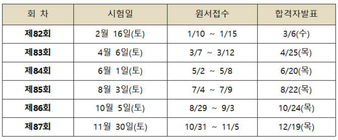 내년 2월 16일을 시작으로 11월 30일까지 총 6회 예정된 시험은 모두 토요일에 치뤄지며, 특히 6월 1일 시험의 경우 원서접수기간에 대체공휴일이 있는 관계로 다른 시험과 달리 접수기간을 1일 더 연장키로 했다.
