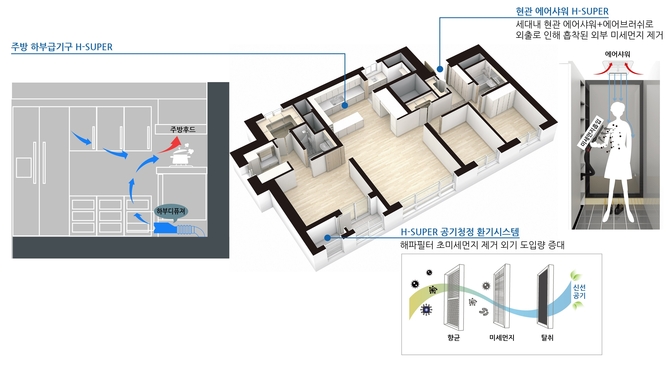 H-SUPER 공기청정 환기시스템은 세대 내 설치된 환기설비에 머리카락 굵기의 약 167분의 1에 해당하는 입자인 0.3μm의 초미세먼지까지 걸러낼 수 있는 H13 등급의 헤파필터·향균·탈취필터 등 3중의 추가필터를 장착해 미세먼지 제거 성능을 99.97%까지 끌어올렸다.