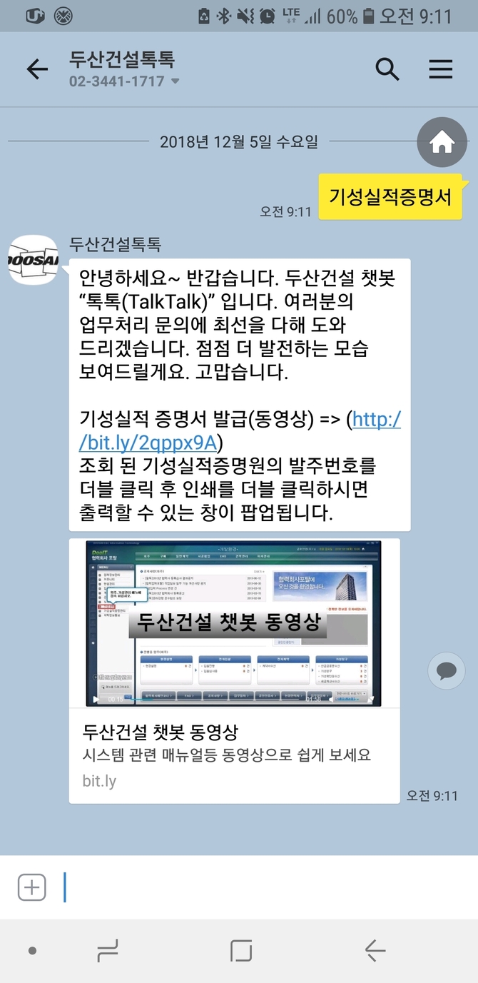 (조세금융신문=이정욱 기자) 두산건설이 5일 협력사와 실시간 업무상담을 할 수 있는 인공지능(AI) 챗봇 서비스 '톡톡(TalkTalk)'을 도입했다.