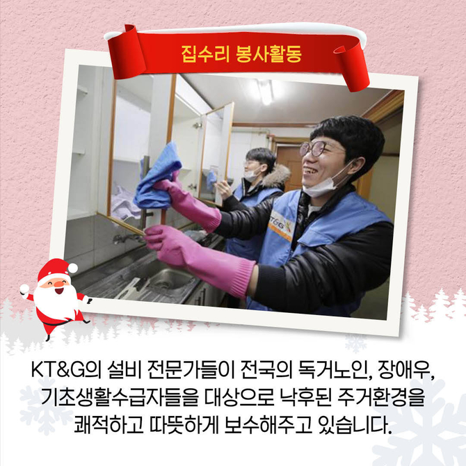 KT&G의 설비 전문가들이 전국의 독거노인, 장애우, 기초생활수급자들을 대상으로 낙후된 주거환경을 쾌적하고 따뜻하게 보수해주고 있습니다.