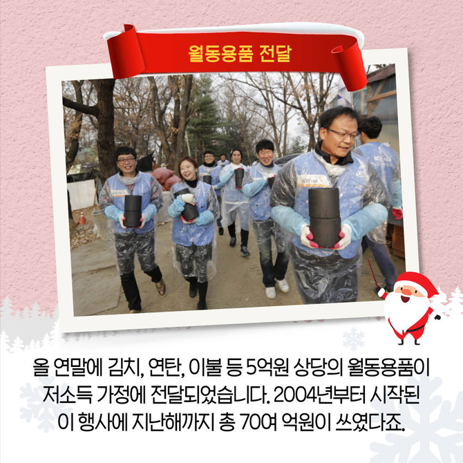 올 연말에 김치, 연탄, 이불 등 5억원 상당의 월동용품이 저소득 가정에 전달되었습니다. 2004년부터 시작된 이 행사에 지난해까지 총 70여 억원이 쓰였다죠.