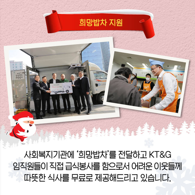사회복지기관에 ‘희망밥차’를 전달하고 KT&G 임직원들이 직접 급식봉사를 함으로서 어려운 이웃들께 따뜻한 식사를 무료로 제공해드리고 있습니다.