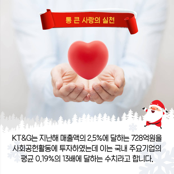 KT&G는 지난해 매출액의 2.5%에 달하는 728억원을 사회공헌활동에 투자하였는데 이는 국내 주요기업의 평균 0.19%의 13배에 달하는 수치라고 합니다.