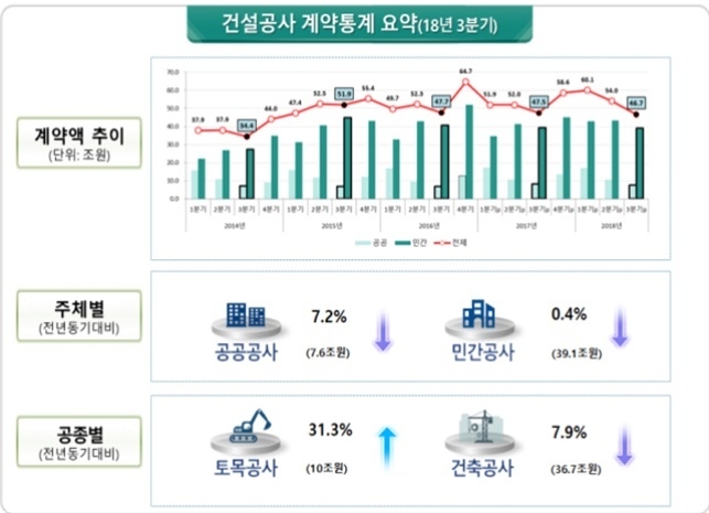 국토교통부는 3분기 계약액은 공공은 7조6000억원으로 작년 동기에 비해 7.2% 감소했고 민간은 39조1000억원으로 0.4% 줄어 공공과 민간 모두 감소했다고 밝혔다.