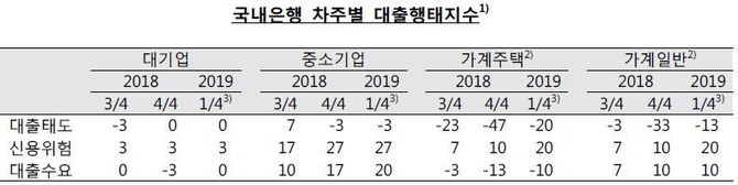 한국은행이 7일 발표한 ‘2018년 4분기 대출행태서베이’에 따르면 1분기 중 국내은행의 가계대출태도와 중소기업 대출태도가 모두 마이너스로 조사됐다.