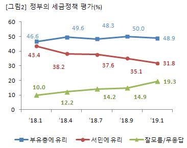 성인의 절반가량이 정부의 세금정책이 부유층에 유리하다고 생각하는 것으로 조사됐다.