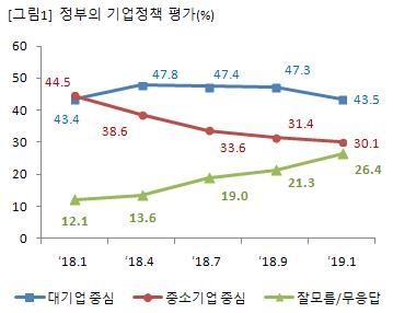 또 현 정부의 기업 정책과 관련해 '대기업 중심'(43.5%)이라는 응답이 '중소기업 중심'(30.1%)보다 많이 나왔다.