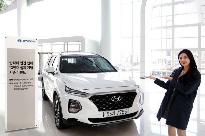 (조세금융신문=김성욱 기자) 현대자동차는 지난해 스포츠유틸리티차(SUV) 최초로 내수 판매 10만대를 돌파한 싼타페의 우수한 상품성을 더 많은 고객이 체험할 수 있도록 ‘싼타페 10만대 돌파 기념 렌탈 시승 이벤트’를 실시한다고 9일 밝혔다.