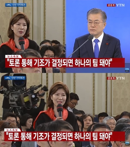 그녀는 10일 청와대에서 열린 기자회견 자리에서 문재인 대통령에게 질의를 할 수 있는 기회를 얻었다.