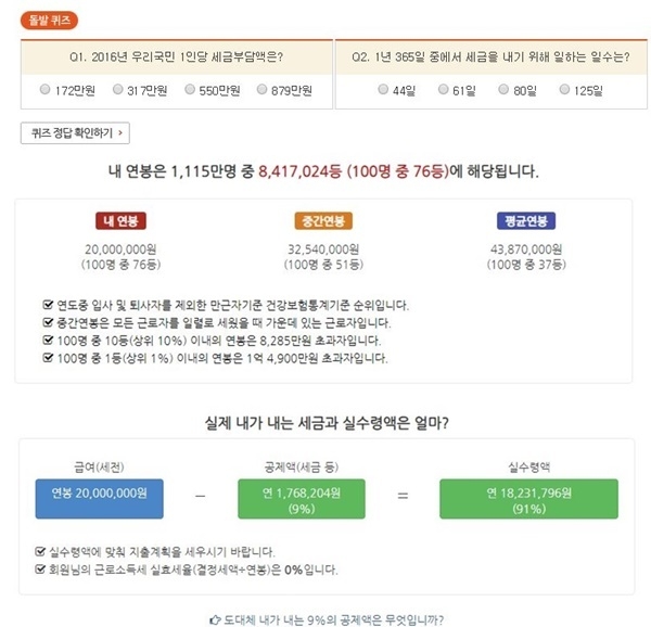 예를 들어 2천만원의 연봉을 입력할 시, "100명 중 76등이다"라는 설명과 함께 실수령액도 공개된다.
