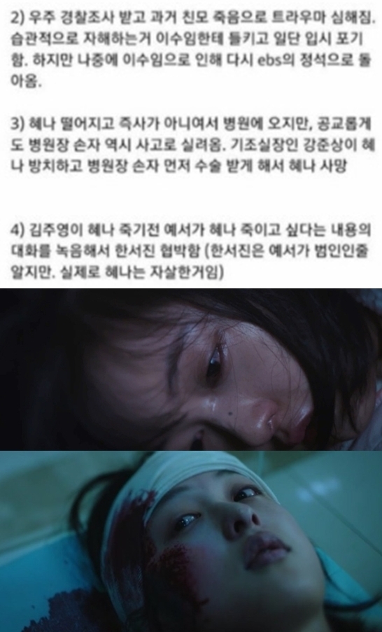'스카이캐슬' 내용과 스포 글의 내용이 맞아떨어진 부분은 "추락한 혜나가 병원에 오지만 공교롭게도 병원장 손자도 사고로 실려오고 강준상이 혜나를 방치하고 병원장 손자를 먼저 수술해 혜나를 사망하게 한다", "우주가 범인으로 몰리는 전개 진행" 등이다.