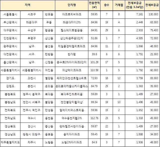 작년 전국 시도별 전용면적 3.3㎡당 전세 최고 거래가 아파트는 서울시 서초구 반포동 아크로리버파크(59.95㎡·7161만원)였다. 경기도는 래미안과천센트럴스위트(72.93㎡)이 지난 12월 3.3㎡당 3759만원에 거래됐다.