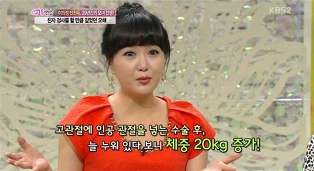 특히 그녀는 KBS의 한 토크쇼에서 "약물 치료 후유증으로 골반이 괴사돼 인공관절을 삽입하는 수술을 받기도 했다"라며 "그땐 허리가 자꾸만 접혀 머리가 땅에 내려갈 정도였다. 지금은 많이 나아졌다"라고 털어놔 눈길을 끌기도 했다.