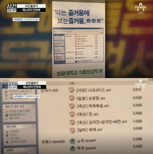 문제가 되는 부분은 메뉴판이다. 음식들의 이름에는 국산과 서양 또 일본 등의 국적의 이름을 넣어 '야동' 파일을 떠올리게 하기 때문이다.