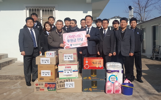 양승권 부산본부세관장과 봉사모임 '여울회' 직원들은 무의탁노인, 중증장애인 등이 따뜻한 명절을 보낼 수 있도록 자발적으로 성금을 모아 떡, 과일 등의 음식, 생필품과 후원금을 전달했다.