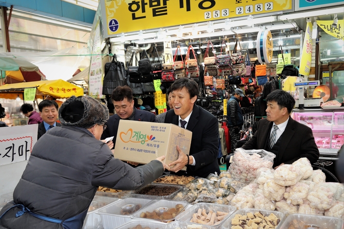 전통시장을 찾은 김 청장은 상인들의 어려움을 청취하면서 온누리상품권으로 직접 과일, 생선 등 명절 성수품도 구매했다.