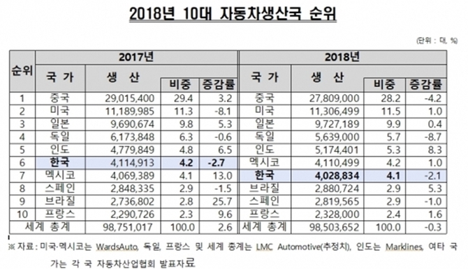 이에 따라 한국의 자동차 생산량 순위는 2016년 인도에 5위 자리를 내어준 지 2년 만에 다시 한 단계 하락하며 멕시코에 밀려 세계 7위로 내려앉았다.