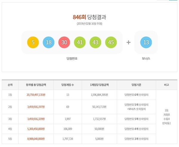 이날 알려진 로또 846회 당첨번호는 '5, 18, 30, 41, 43, 45'로 전해졌다.