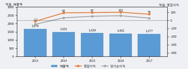 최근 3년간의 실적을 살펴보면, 매출액은 3년 연속 하락하고 있으나 그 하락폭은 줄어들고 있음을 알 수 있다.