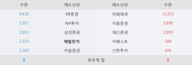 이 시각 주요 거래원은 미래에셋, 키움증권, 대신증권 등이 매수 상위 창구에 자리하고 있다. 한편, 매도 창구 상위에는 메릴린치가 눈에 띄고 있다.