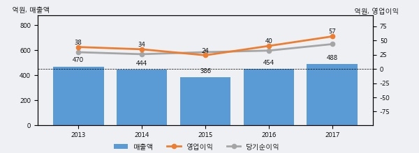 최근 실적을 살펴보면 2017년 매출액이 최근 5년 중 가장 높은 실적을 기록했음을 알 수 있다. 이전 최고 실적이었던 2013년 보다도 3.7%(17억 5천만원) 늘어난 것으로 나타났다.