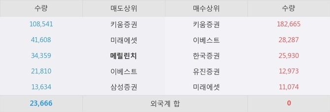 이 시각 주요 거래원은 미래에셋, 키움증권, 이베스트 등이 매수 상위 창구에 자리하고 있다. 한편, 매도 창구 상위에는 메릴린치가 눈에 띄고 있다.