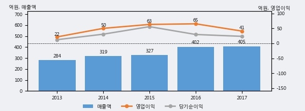 최근 3년간의 실적을 살펴보면 안정적 성장세를 보이고 있다. 최근 3년간 매출로 볼 때 매년 꾸준히 증가하고 있다. 다만 최근에 그 증가폭이 다소 감소하고 있다.