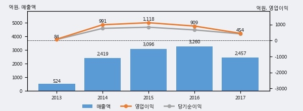 잇츠한불의 2017년 매출액은 전년대비 -24.6% 줄어든 2457억원이고, 영업이익 역시 전년대비 -50.1% 줄어든 454억원을 기록했다. 이 회사의 매출액 증감률과 영업이익 증감률은 각각 코스피 하위 3%, 하위 19%에 해당된다.