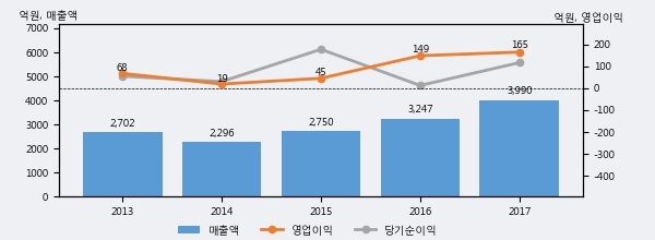 최근 3년간의 실적을 살펴보면 안정적 성장세를 보이고 있다. 최근 3년간 매출로 볼 때 매년 증가하고 있고 그 증가폭도 확대되고 있다.