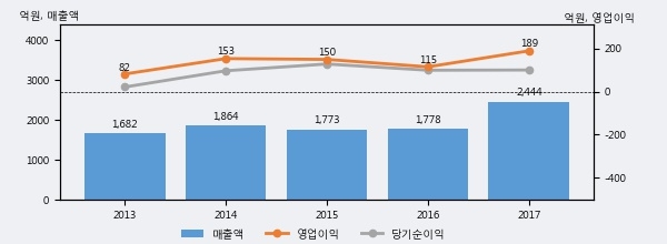 최근 실적을 살펴보면 2017년 매출액이 최근 5년 중 가장 높은 실적을 기록했음을 알 수 있다. 이전 최고 실적이었던 2014년 보다도 31.1%(579억 8천만원) 늘어난 것으로 나타났다.