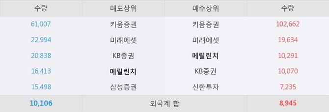 거래원 동향은 메릴린치, 미래에셋이 매수 상위 목록에 나타나고 있다. 한편, 매도 창구 상위에는 메릴린치가 눈에 띄고 있다.