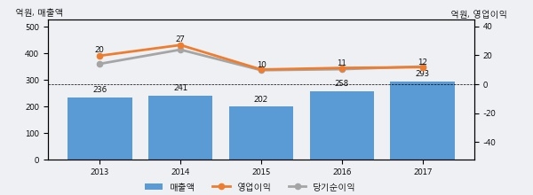 최근 실적을 살펴보면 2017년 매출액이 최근 5년 중 가장 높은 실적을 기록했음을 알 수 있다. 이전 최고 실적이었던 2016년 보다도 13.6%(35억원) 늘어난 것으로 나타났다.