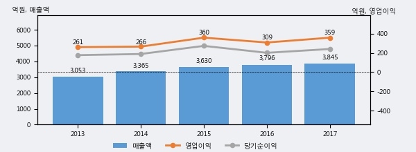 최근 3년간의 실적을 살펴보면 안정적 성장세를 보이고 있다. 최근 3년간 매출로 볼 때 매년 꾸준히 증가하고 있다. 다만 최근에 그 증가폭이 다소 감소하고 있다.