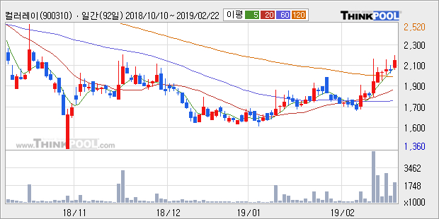 컬러레이의 2017년 매출액은 전년대비 22.3% 늘어난 477억원이고, 영업이익 또한 전년대비 21.9% 늘어난 275억원을 기록했다. 이 회사의 매출액 증감률과 영업이익 증감률은 각각 코스닥 상위 27%, 상위 39%에 해당된다.