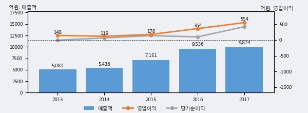 최근 3년간의 실적을 살펴보면 안정적 성장세를 보이고 있다. 최근 3년간 매출로 볼 때 매년 꾸준히 증가하고 있다. 다만 최근에 그 증가폭이 다소 감소하고 있다.