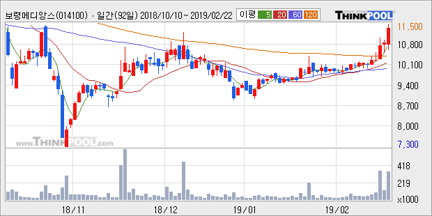 추세선으로 보면 현재 단기·중기 이평선이 정배열 상태로 전형적인 상승세를 보이고 있다. 최근 이 종목의 차트에서 최근 60일 매물대 돌파 등의 특이사항이 발생했다.