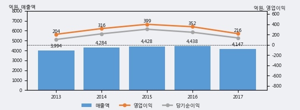 벽산의 2017년 매출액은 4147억으로 전년대비 -6.6% 하락했고, 영업이익 역시 216억으로 전년대비 -38.4% 하락했다. 이 회사의 매출액 증감률과 영업이익 증감률은 각각 코스피 하위 16%, 하위 24%에 해당된다.