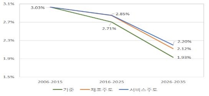 이후 2026년부터 2035년까지 10년 동안에도 4차 산업혁명의 긍정적 영향이 본격화되면서 연평균 성장률은 서비스 주도형의 경우 2.20%, 제조업 주도형의 경우 2.12%를 기록하며 경제성장의 둔화 속도를 조절하는 역할을 해낼 것으로 나타났다.
