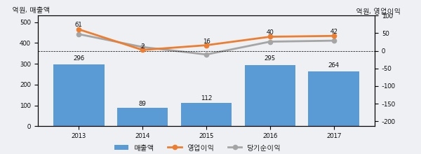 YW의 2017년 매출액은 264억으로 전년대비 -10.4% 하락했고, 영업이익은 42억으로 전년대비 6.0% 상승했다. 이 회사의 매출액 증감률과 영업이익 증감률은 각각 코스닥 하위 19%, 상위 48%에 해당된다.