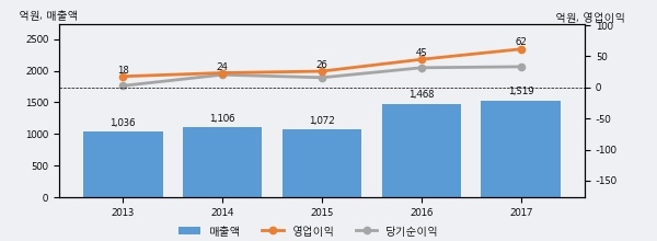 최근 실적을 살펴보면 2017년 매출액이 최근 5년 중 가장 높은 실적을 기록했음을 알 수 있다. 이전 최고 실적이었던 2016년 보다도 3.5%(51억 2천만원) 늘어난 것으로 나타났다.