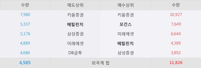 거래원 동향은 모건스, 메릴린치, 미래에셋 등이 매수 상위 목록에 위치하고 있다. 한편, 매도 창구 상위에는 메릴린치가 눈에 띄고 있다.
