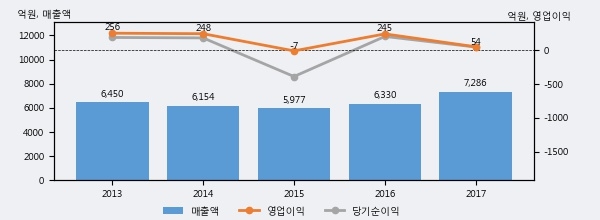 최근 실적을 살펴보면 2017년 매출액이 최근 5년 중 가장 높은 실적을 기록했음을 알 수 있다. 이전 최고 실적이었던 2013년 보다도 13.0%(836억원) 늘어난 것으로 나타났다.